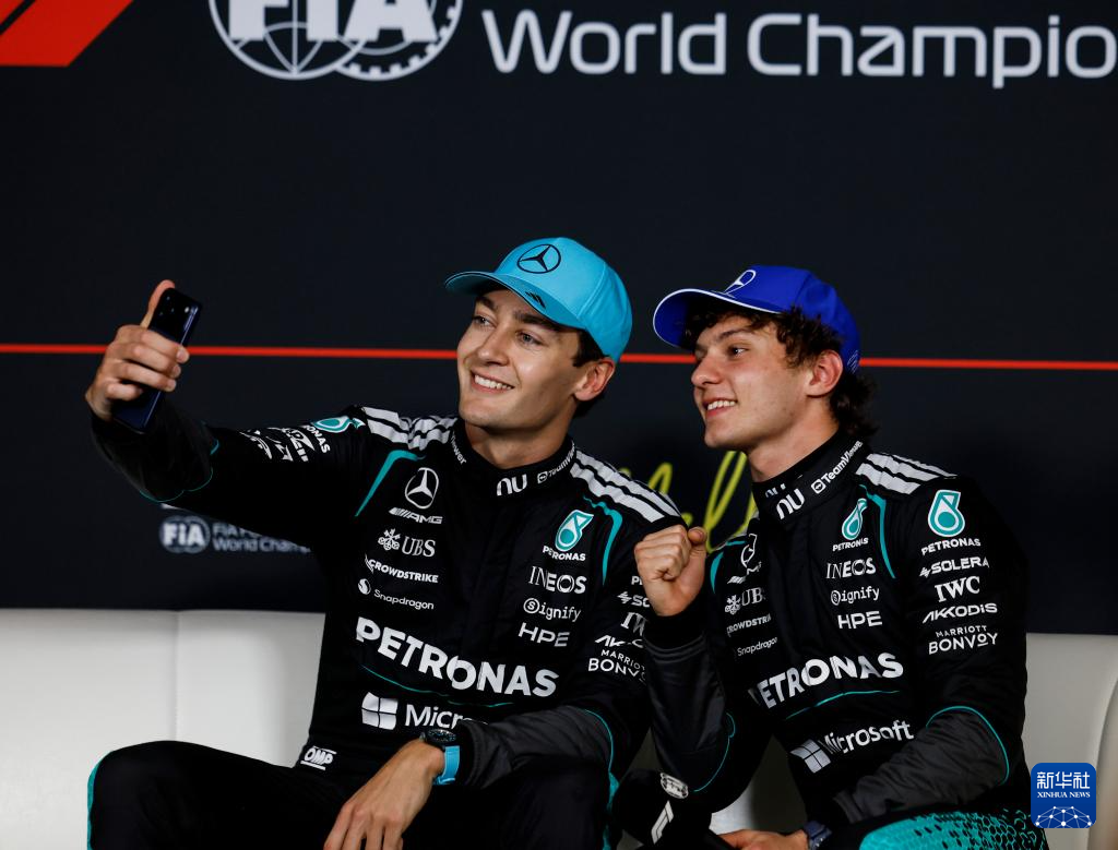 3月7日,梅赛德斯车队车手拉塞尔(左)和队友安东内利出席排位赛后的新闻发布会。