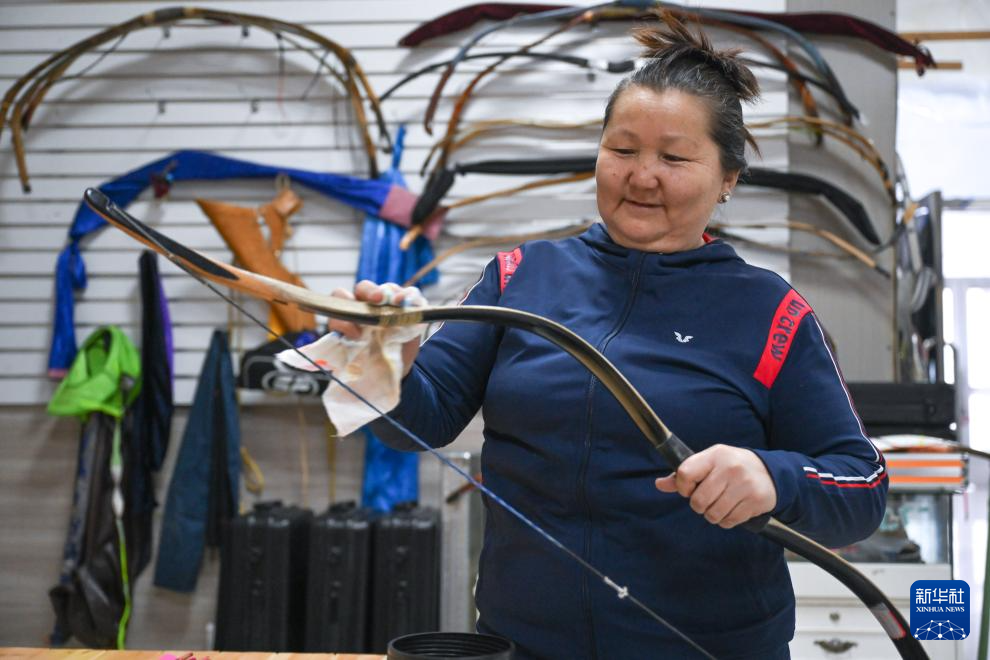 3月4日,图雅在鄂温克族自治旗体育事业发展中心保养弓。新华社记者 贝赫 摄