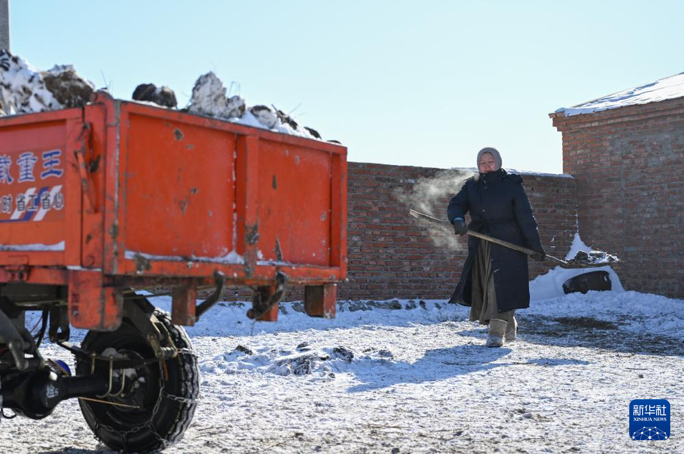 3月4日,图雅在位于鄂温克族自治旗锡尼河西苏木的圈舍内铲牛粪。新华社记者 贝赫 摄