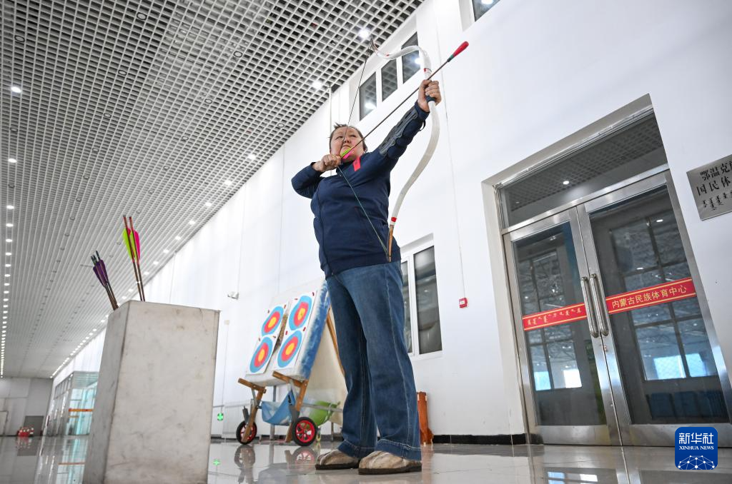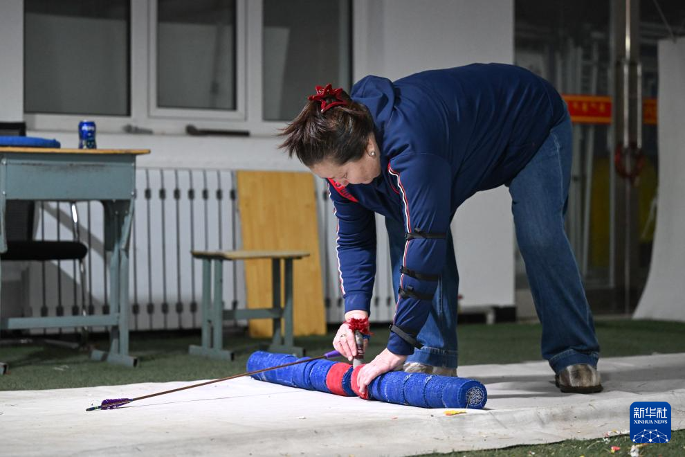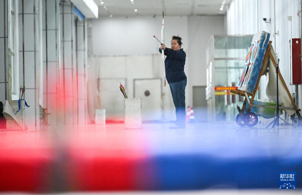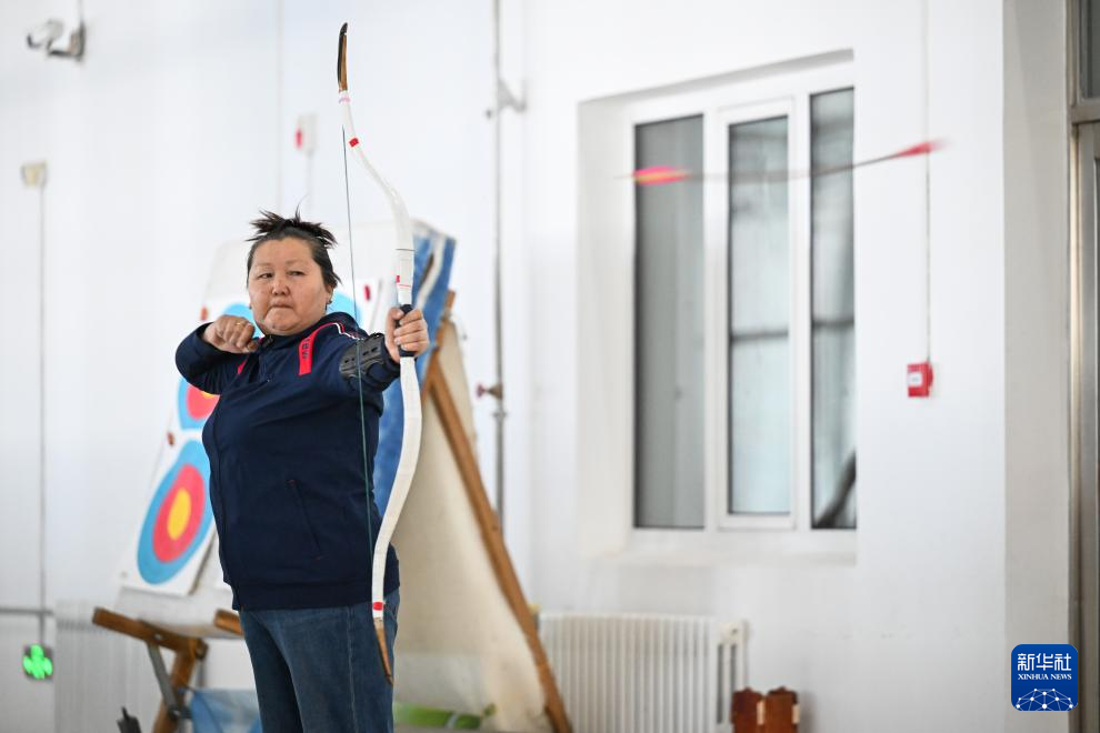 3月4日,图雅在鄂温克族自治旗体育事业发展中心练习射箭。新华社记者 贝赫 摄
