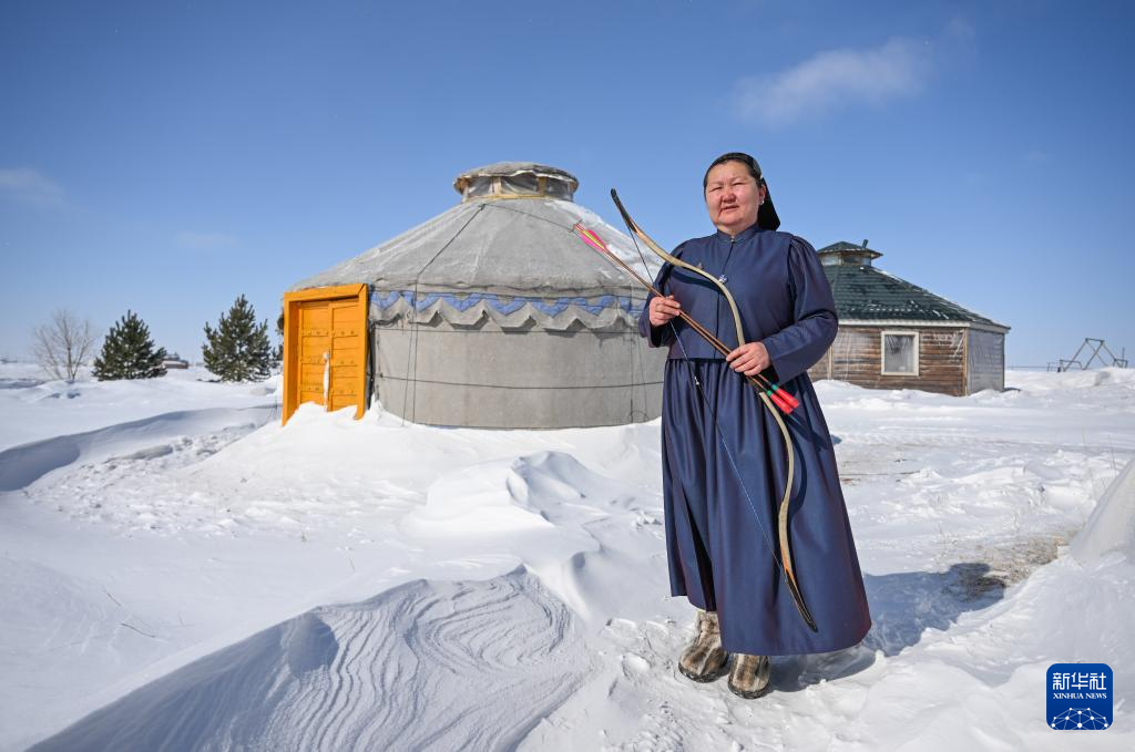 3月4日在鄂温克族自治旗锡尼河西苏木拍摄的手持弓箭的图雅。新华社记者 贝赫 摄