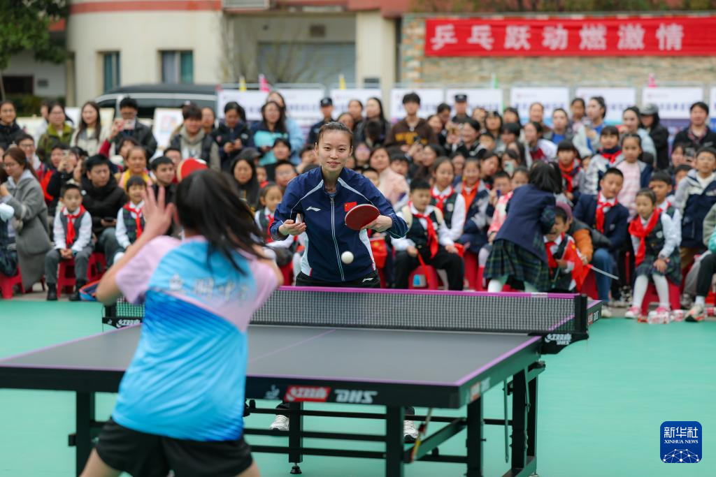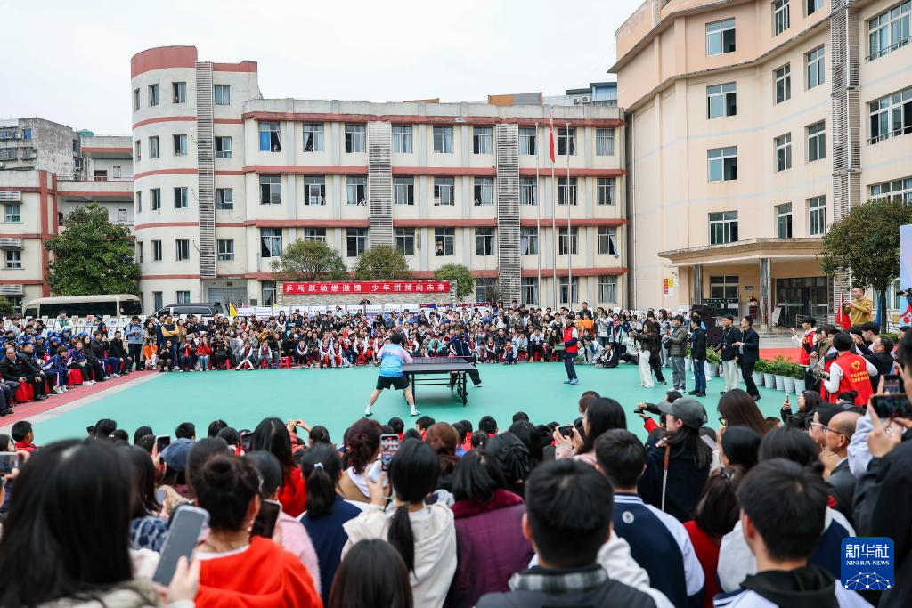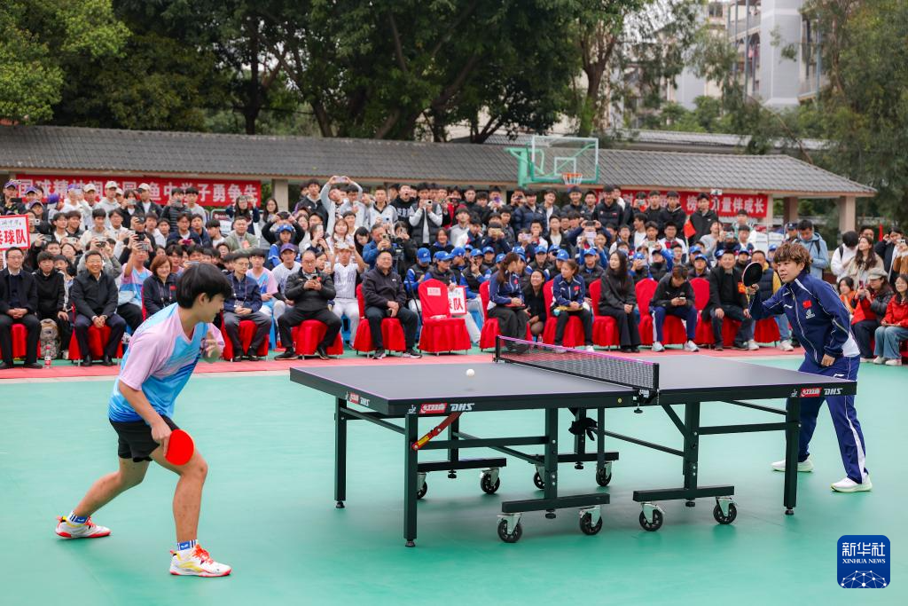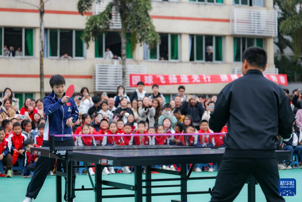 3月8日,国家乒乓球队女队队员石洵瑶与鱼洞中学乒乓球项目优秀学生代表交流球技。