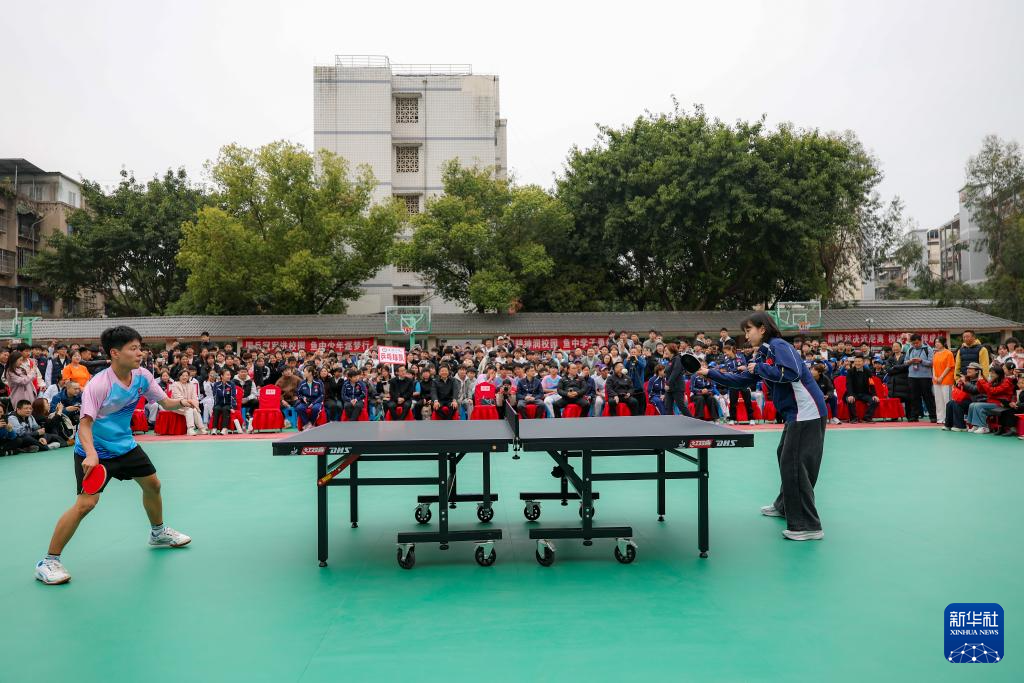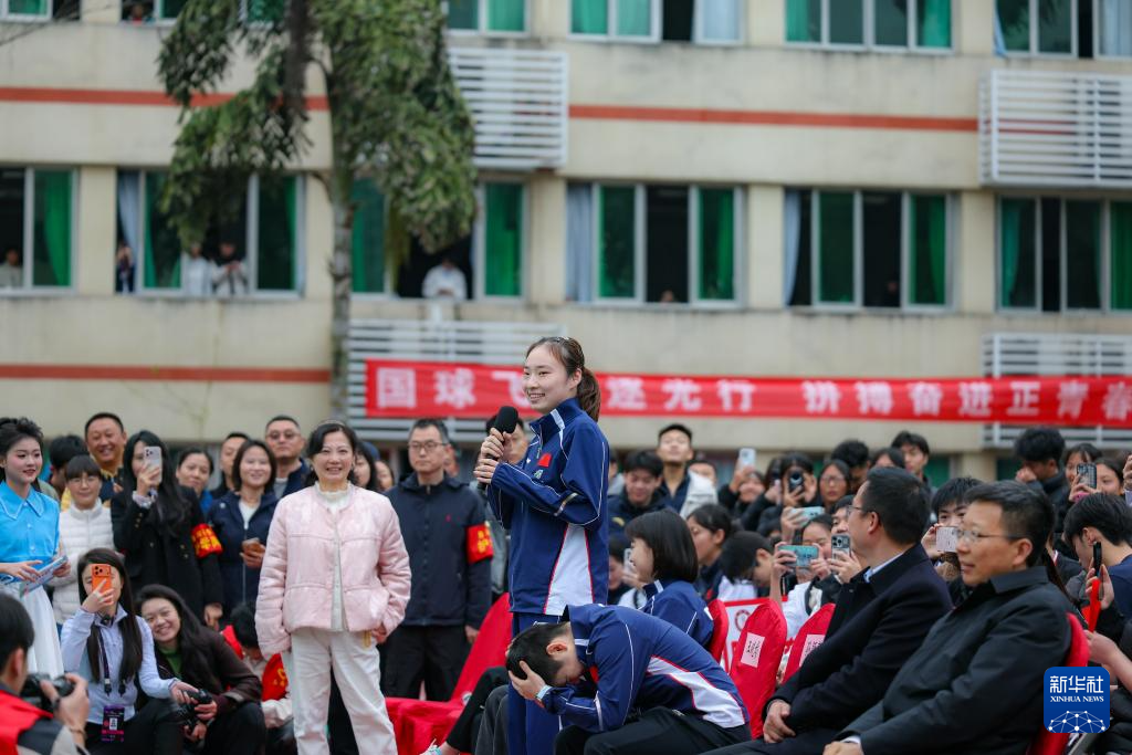 3月8日,国家乒乓球队女队队员王晓彤与鱼洞中学学生现场交流。