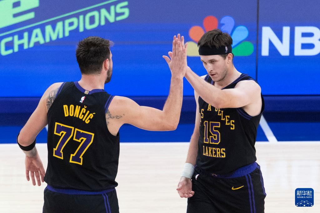 3月10日,湖人队球员奥斯汀·里夫斯(右)在比赛中与队友卢卡·东契奇庆祝进球。