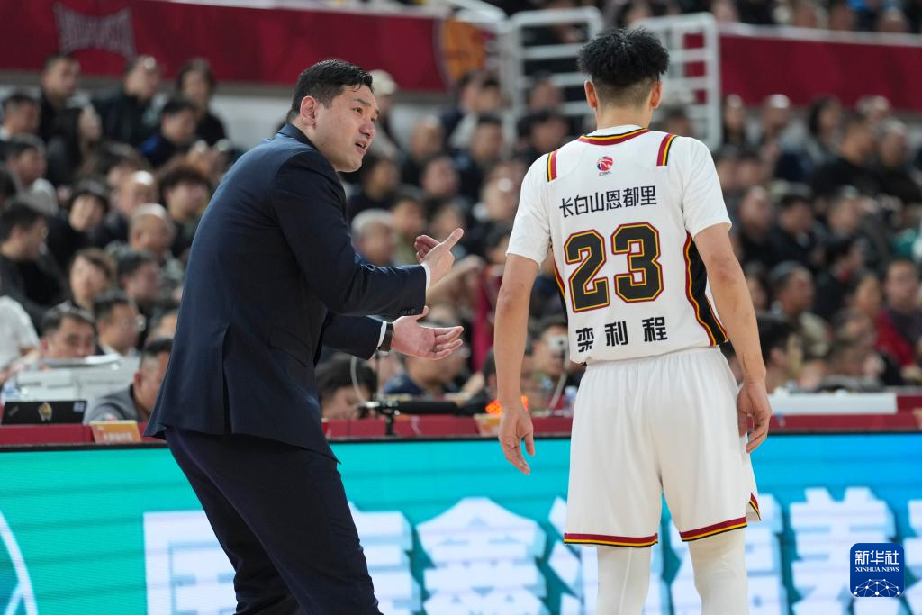 3月11日,吉林长白山恩都里队主教练钟诚(左)在场边和球员栾利程沟通。