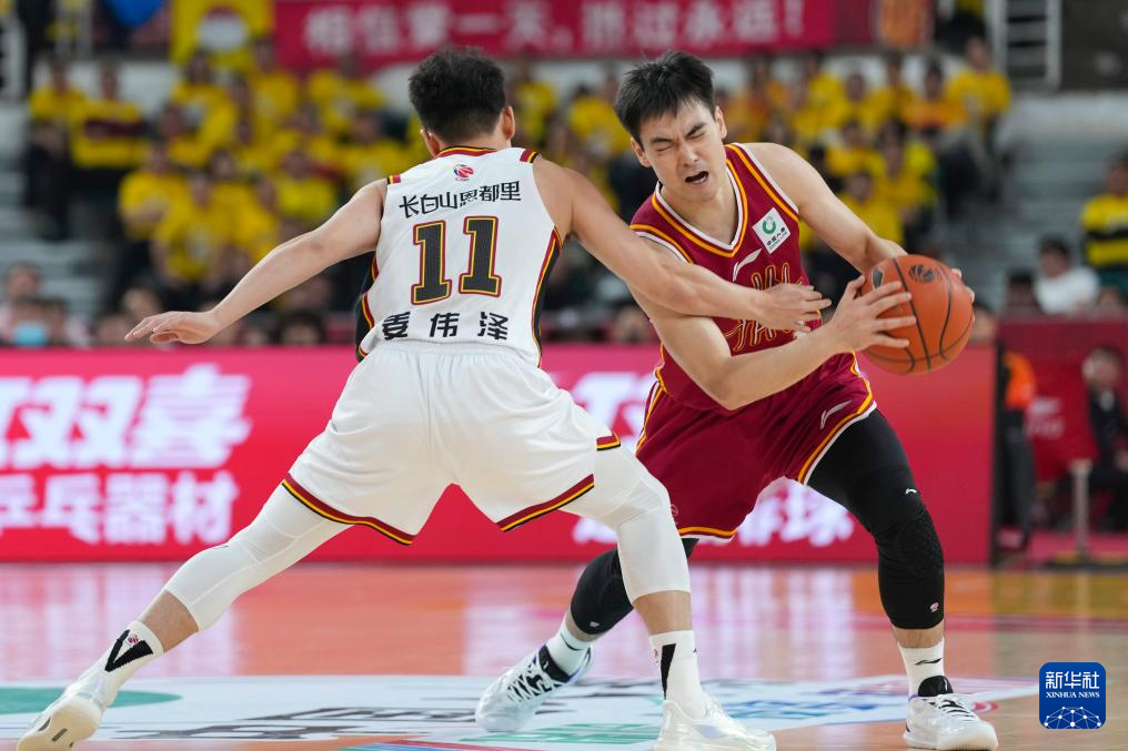 3月11日,吉林长白山恩都里队球员姜伟泽(左)和山西汾酒队球员于米提在比赛中争抢。