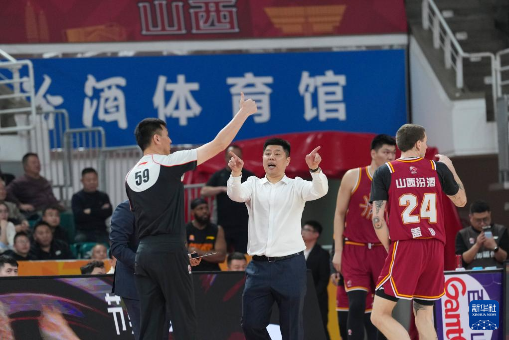 3月11日,山西汾酒队主教练潘江(左二)在比赛中向裁判申请挑战。