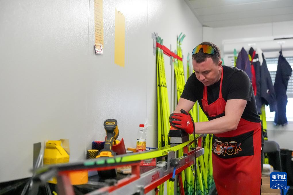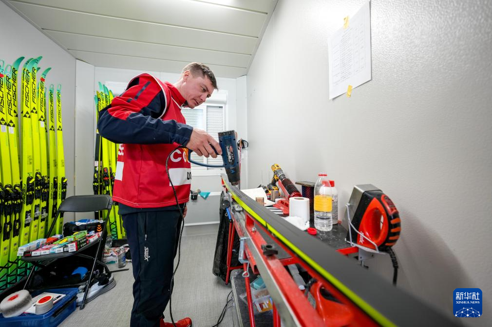 3月9日,在泰塞罗越野滑雪中心,助理教练兼打蜡师亚历山大·维谢洛夫为运动员们的雪板打蜡。新华社记者 连振 摄