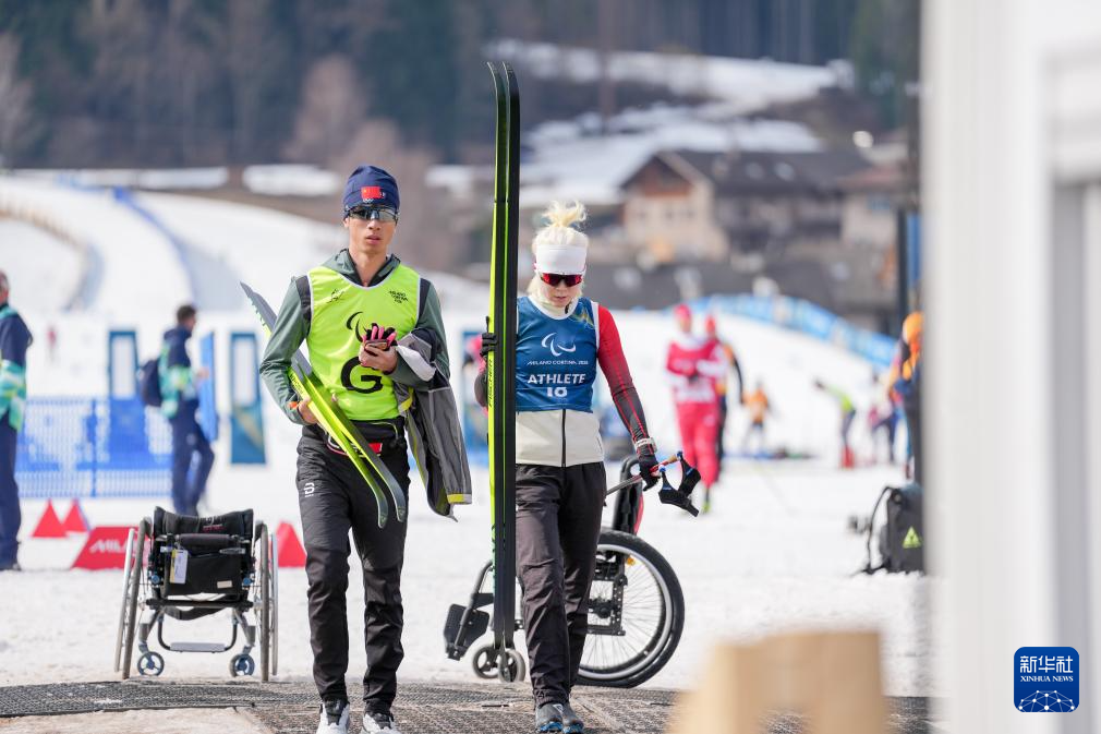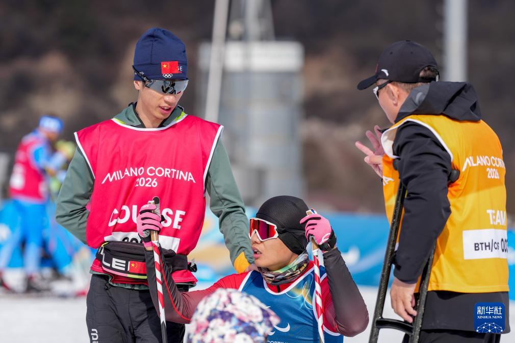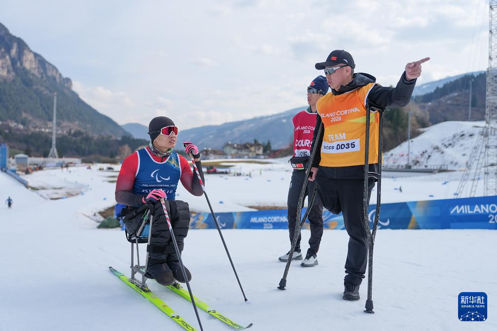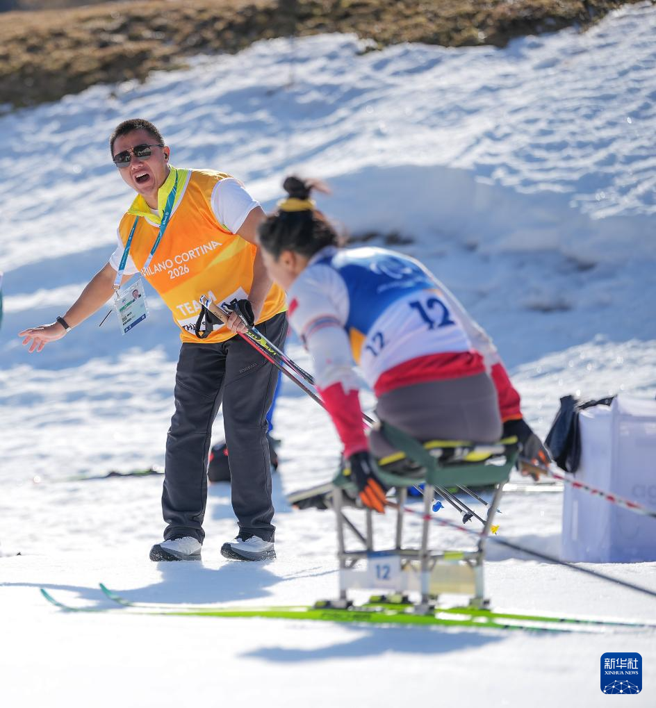 3月8日,在泰塞罗越野滑雪中心,中国国家冬残奥越野滑雪和冬季两项队副领队杨明(左)在米兰-科尔蒂纳冬残奥会残奥冬季两项女子中距离(坐姿)比赛中鼓励队员王诗瑀。新华社记者 侯昭康 摄