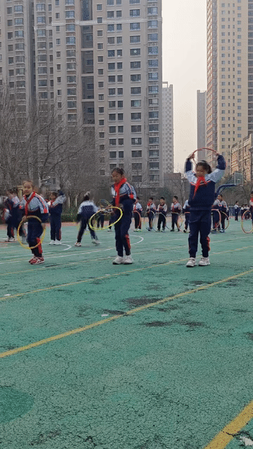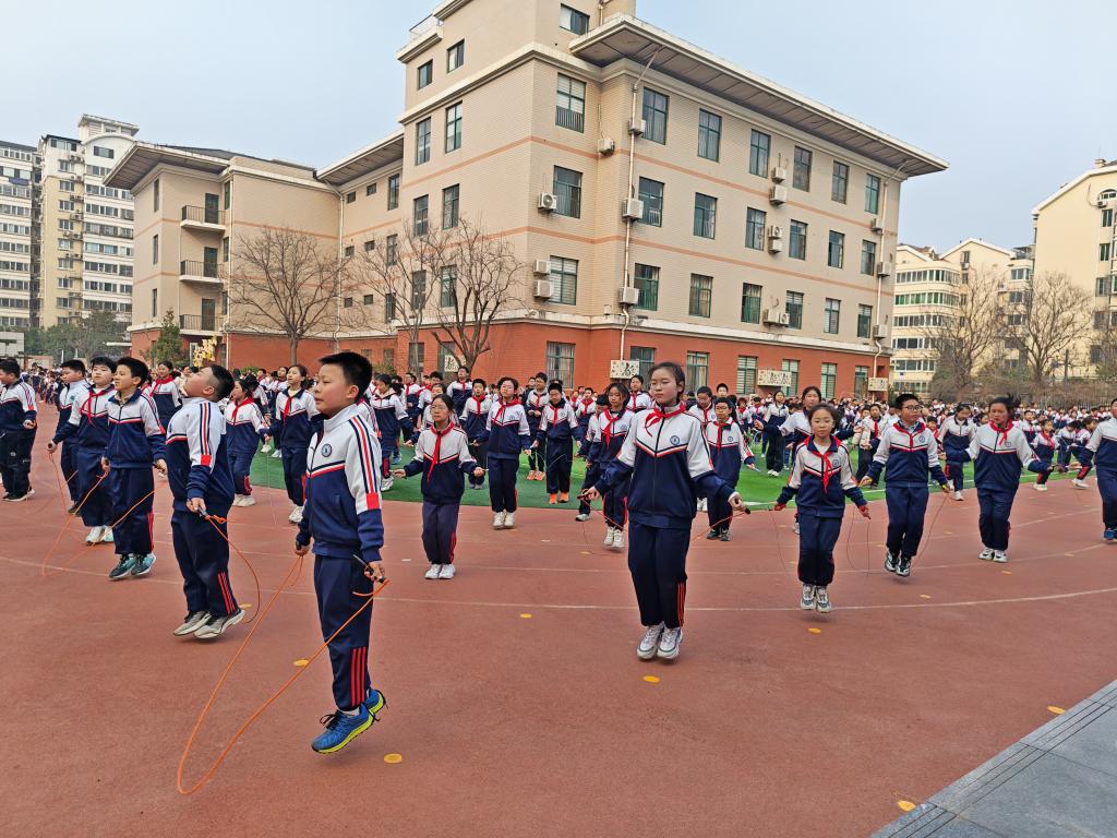 “场地有限,但孩子的成长不能受限。”泉星小学体育老师张晓艺说,为了让孩子们在小场地中有足够运动量,她和同事们精心设计蛇形盘旋前进的跑操路线和为集体跳绳创造空间的斜向方阵,让全校800多名学生可以同时进行大课间活动。