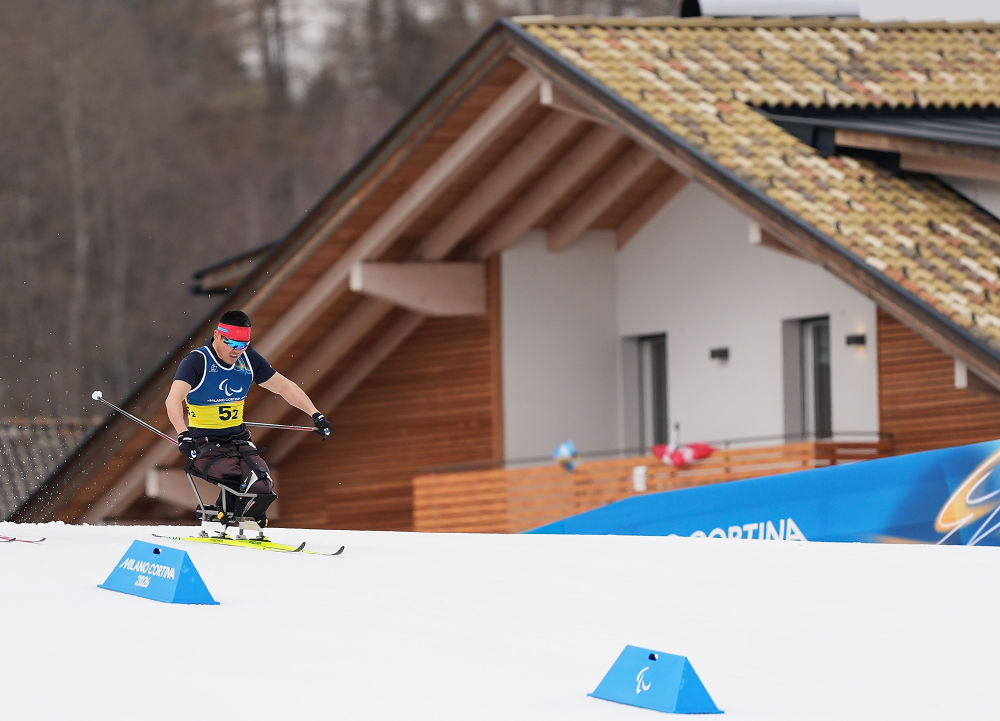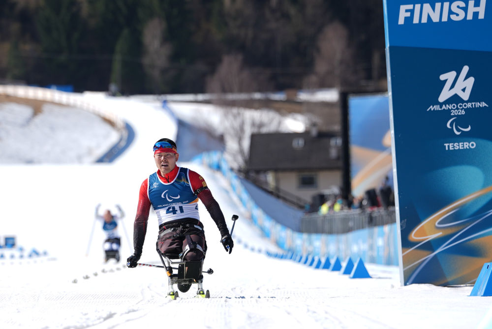 3月7日,中国选手王涛在米兰-科尔蒂纳冬残奥会冬季两项男子短距离(坐姿)比赛中抵达终点。新华社记者 侯昭康 摄