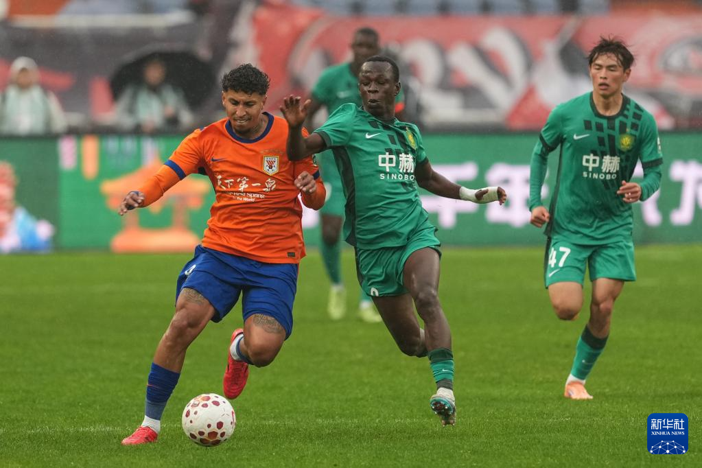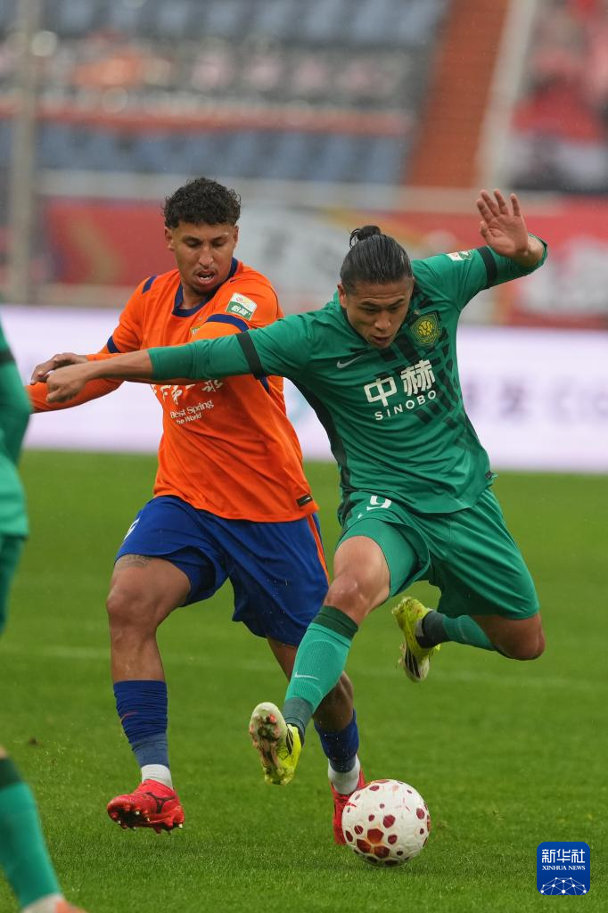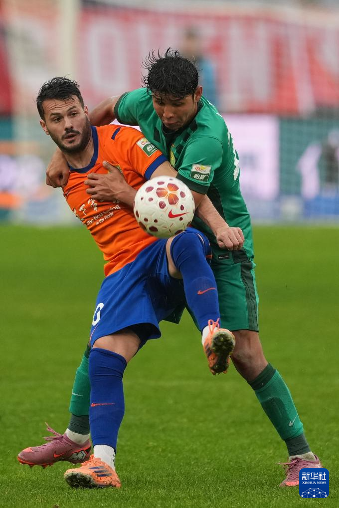 3月14日,山东泰山队球员泽卡(右)在比赛中争球。