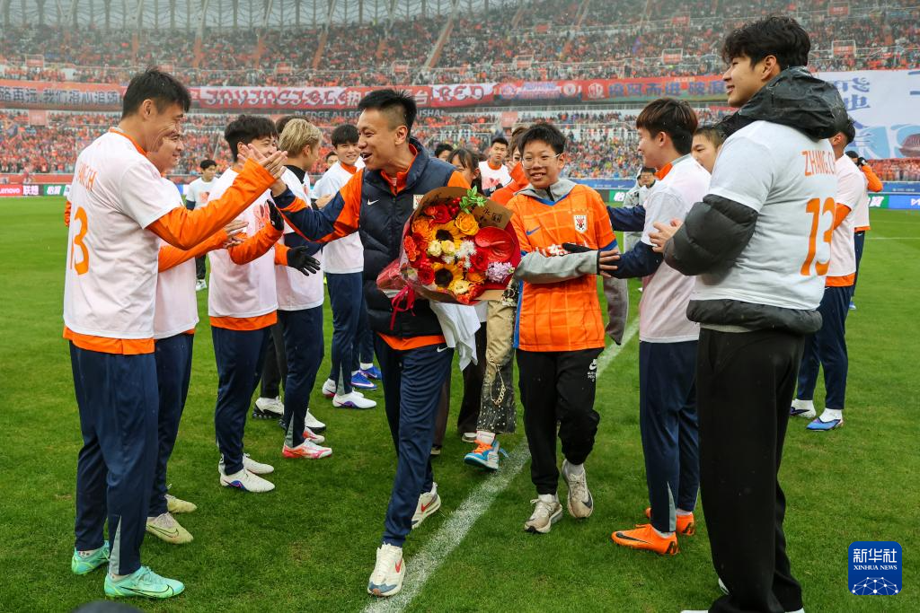3月14日,山东泰山队球员张弛(中)在赛前参加退役仪式。