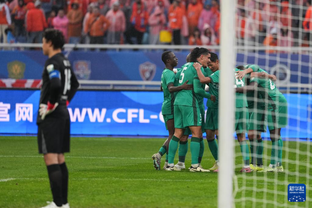 3月14日,山东泰山队球员在比赛中庆祝进球。