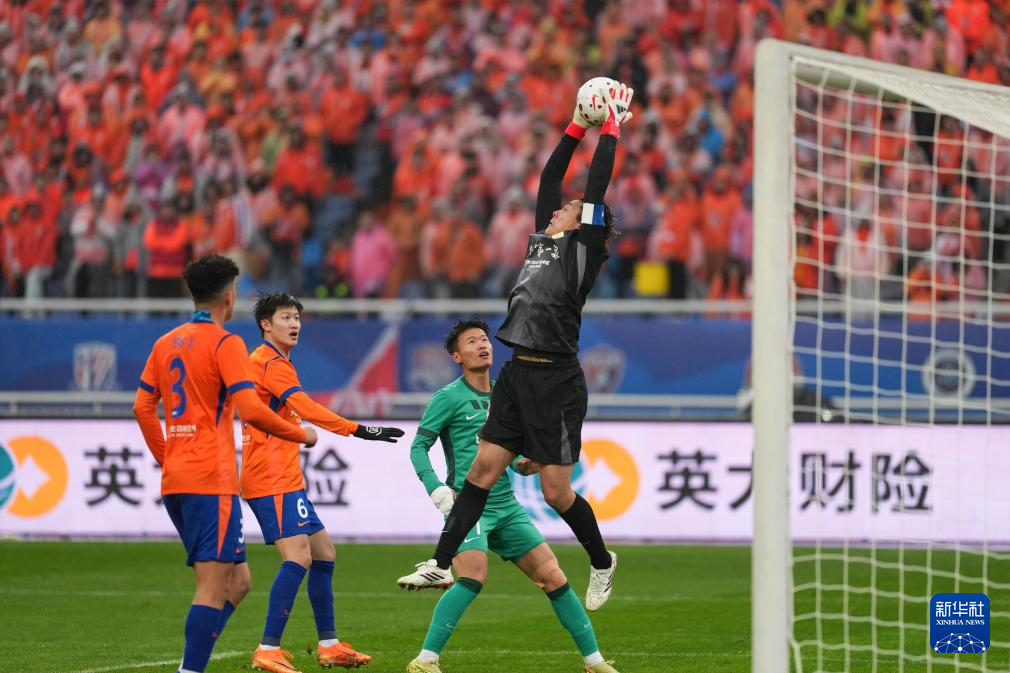 3月14日,山东泰山队守门员王大雷(右)在比赛中扑出对方球员射门。