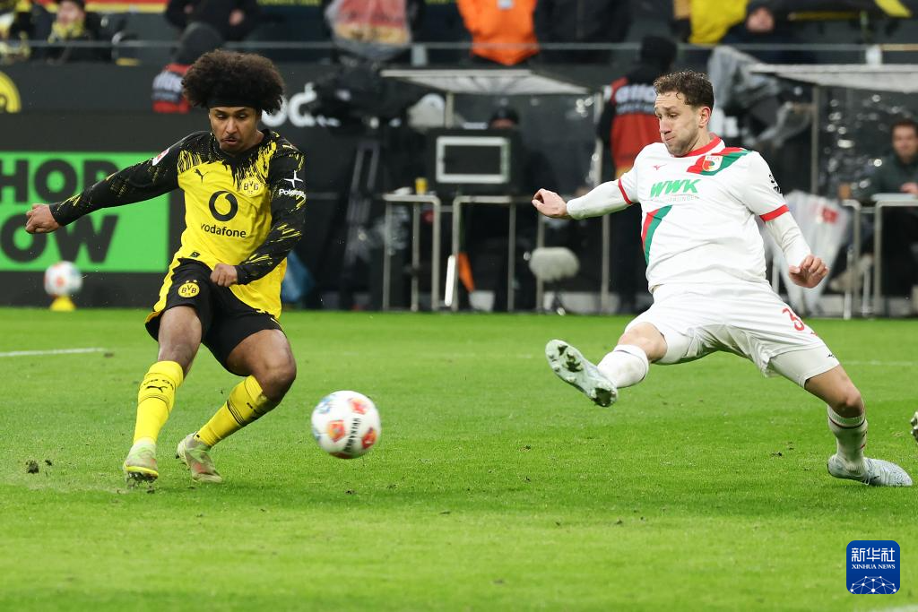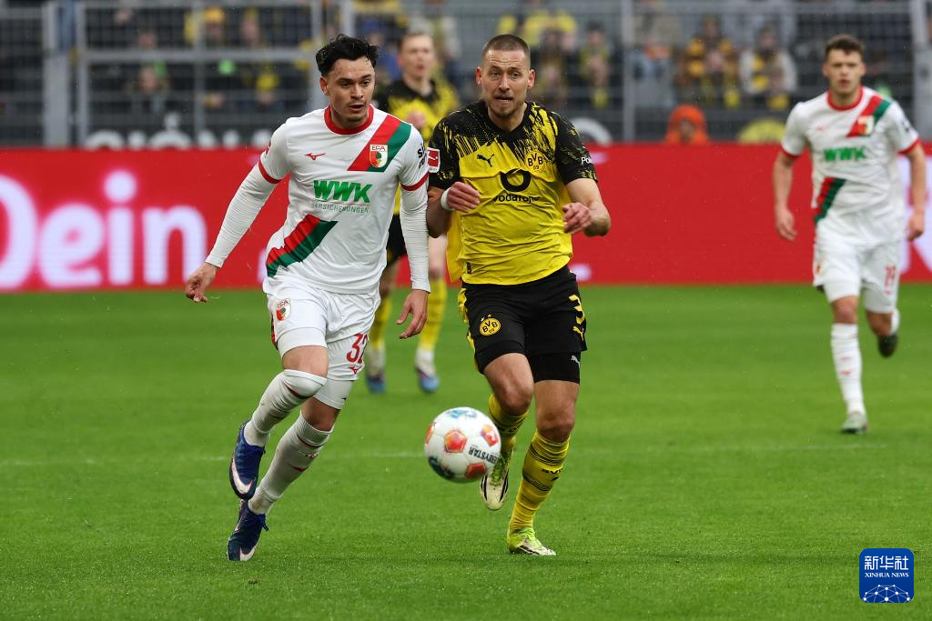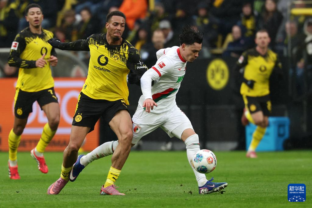 3月14日,多特蒙德队球员恩梅查(左)与奥格斯堡队球员里德在比赛中拼抢。