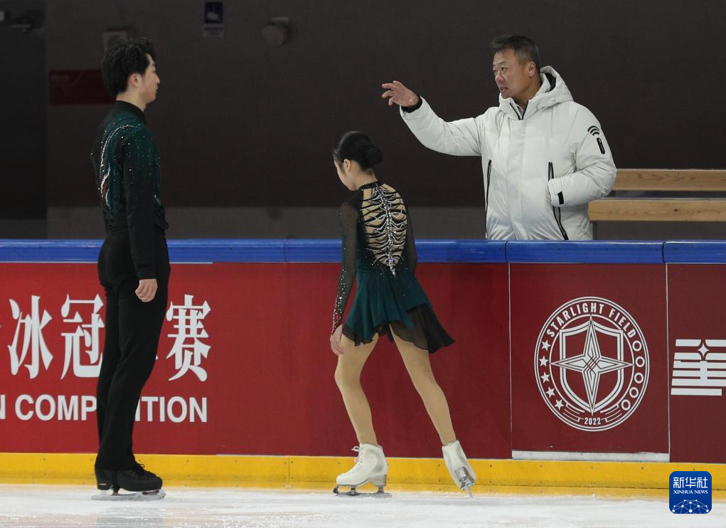 3月15日,教练、奥运冠军赵宏博(右)在比赛中指导齐齐哈尔市冬季运动项目中心组合郭蕊(中)/ 张益文。