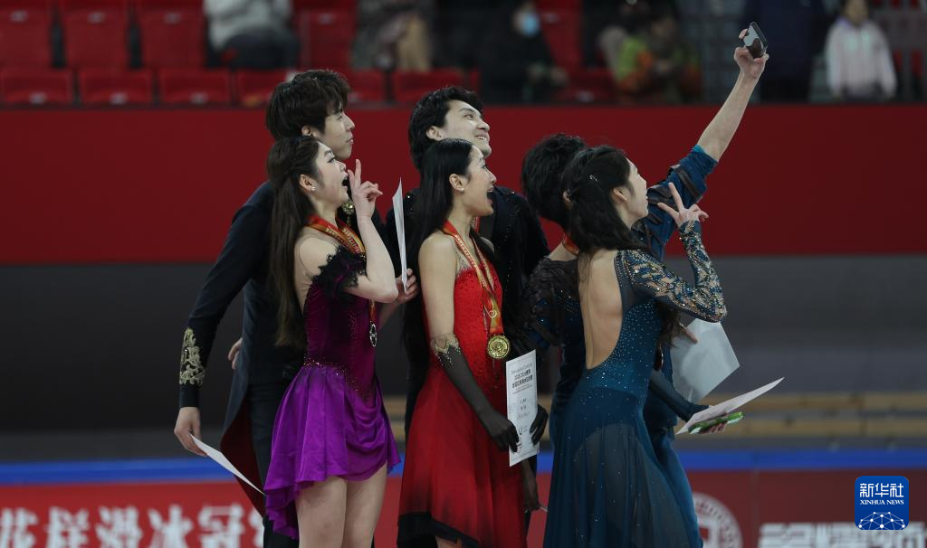 3月15日,冰舞项目冠军黑龙江省冰上训练中心组合任俊霏(前中)/ 邢珈宁(后中)、亚军吉林省体育局冰上运动管理中心组合林宇飞(前左)/ 高子健(后左)和季军辽宁省冬季运动管理中心组合殷善洁(前右)/杨士锐在颁奖仪式上自拍。