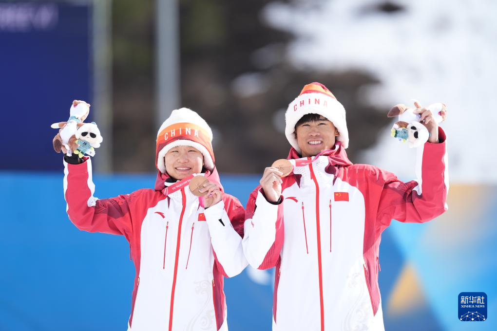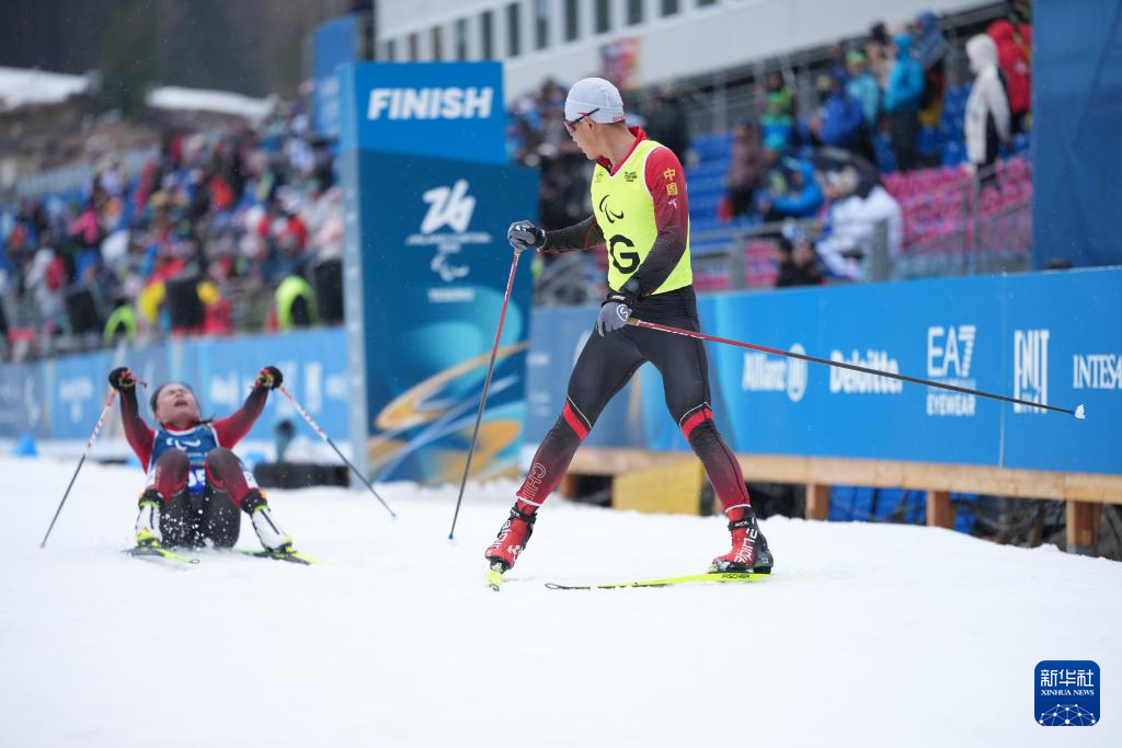 3月15日,中国选手丛吉鸿(左)与引导员刘佳璇在冲过终点后。