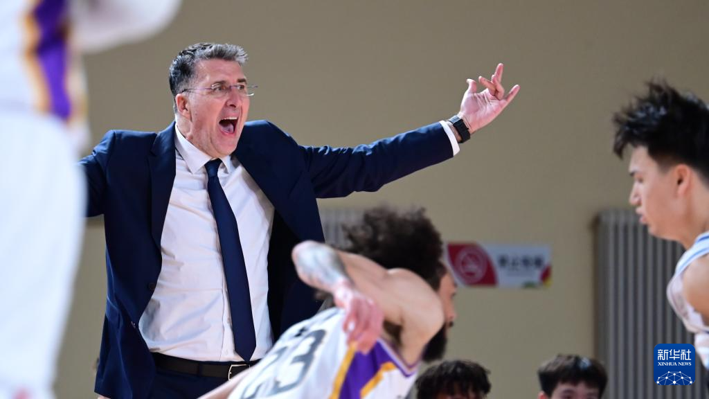 3月15日,新疆伊力特队主教练格兰(后)在场边指导球员。