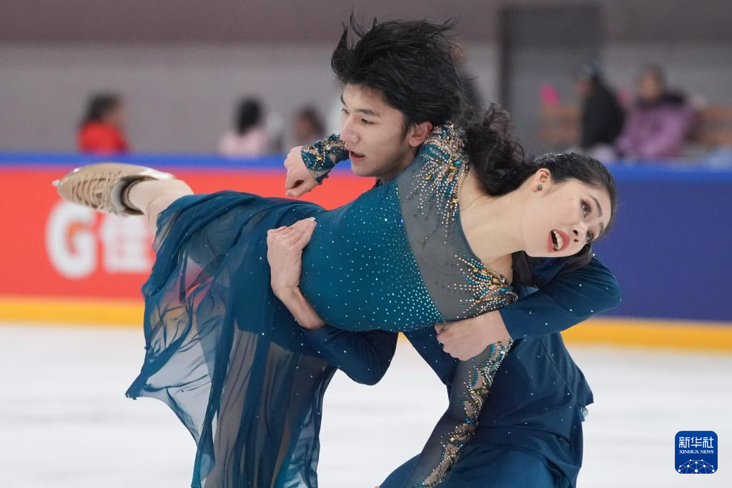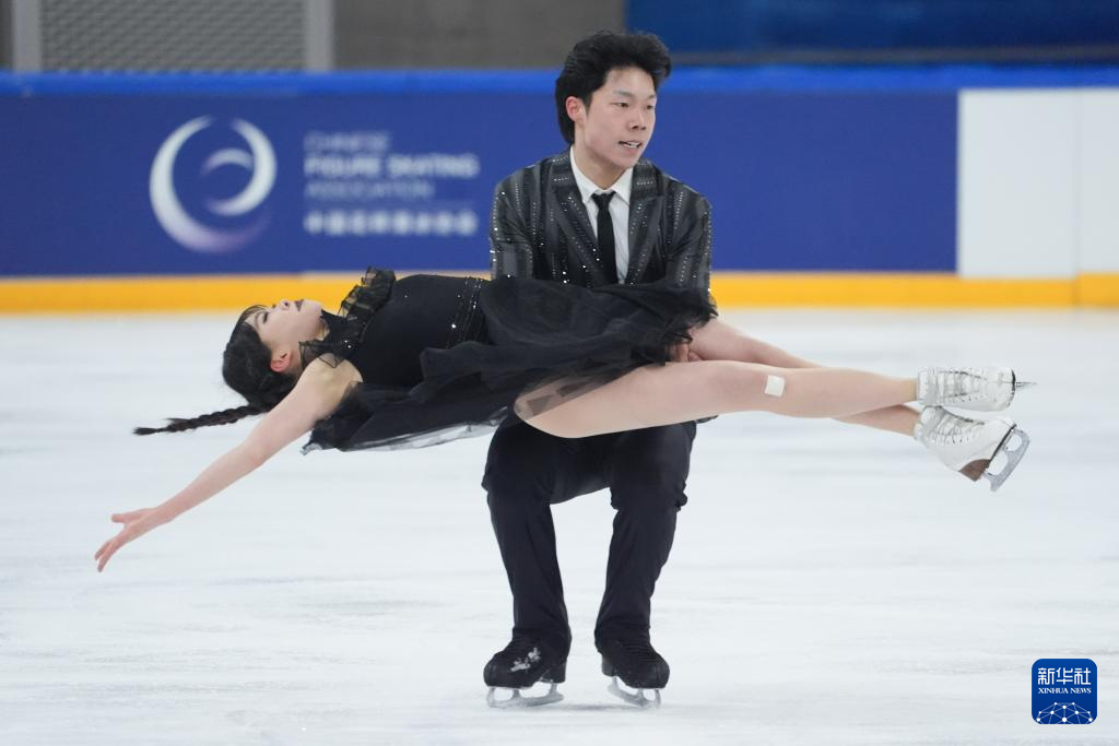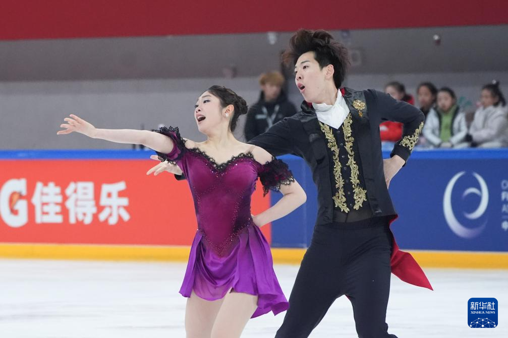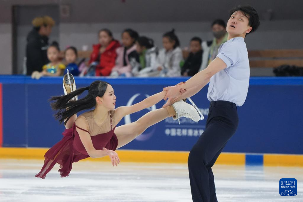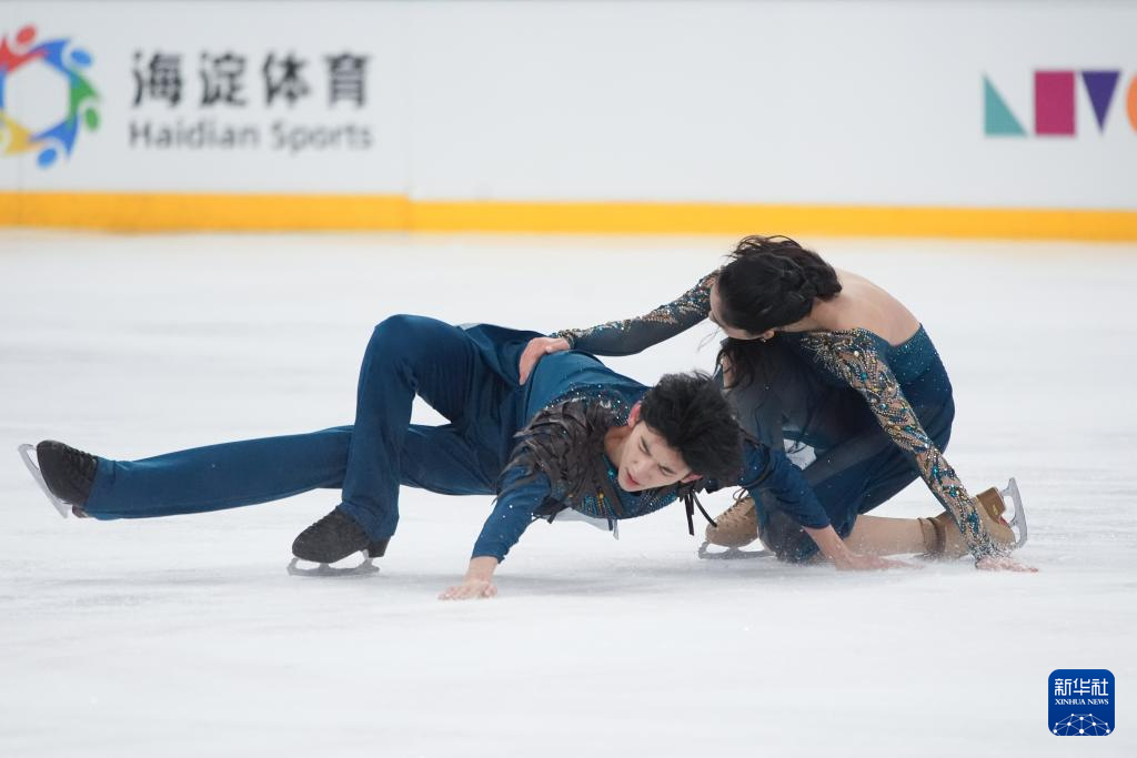 3月15日,吉林省体育局冰上运动管理中心队选手高瑀浠(前)/季周灏在比赛中。