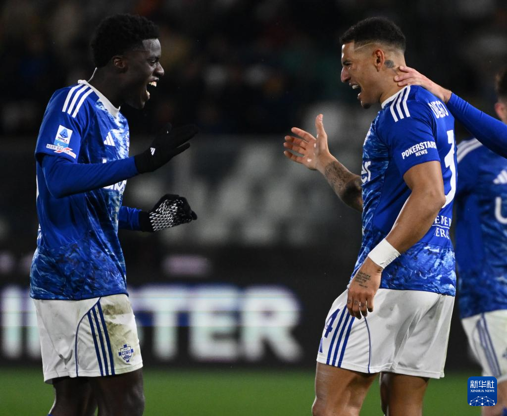 3月15日,科莫队球员杜维卡斯(左)与队友拉蒙庆祝进球。