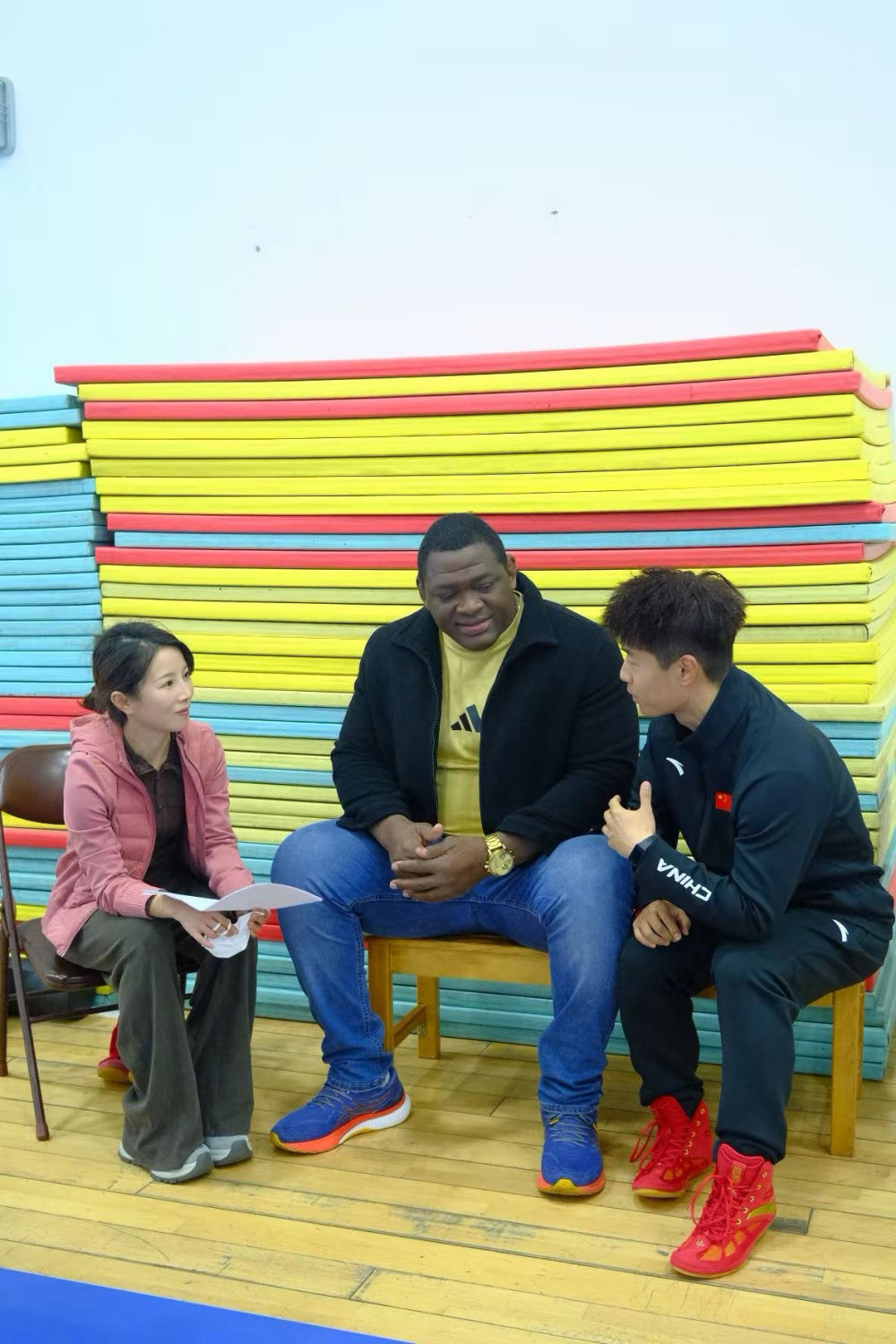 记者与洛佩斯(中)、中国古典摔跤队西语翻译沈士琰(右)在采访中。新华社记者 杨博毅 摄