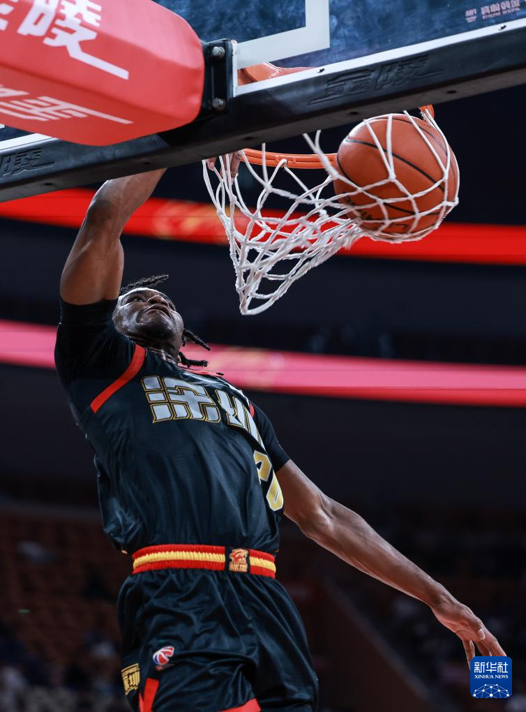 3月20日,新疆伊力特队球员门内加(中上)在比赛中扣篮。