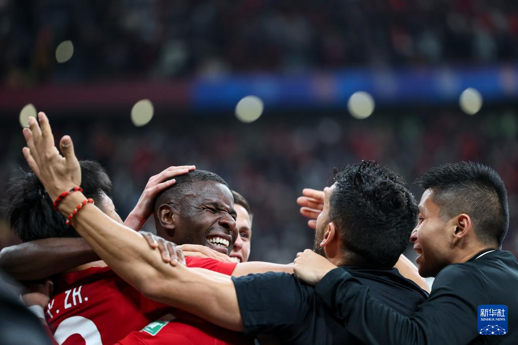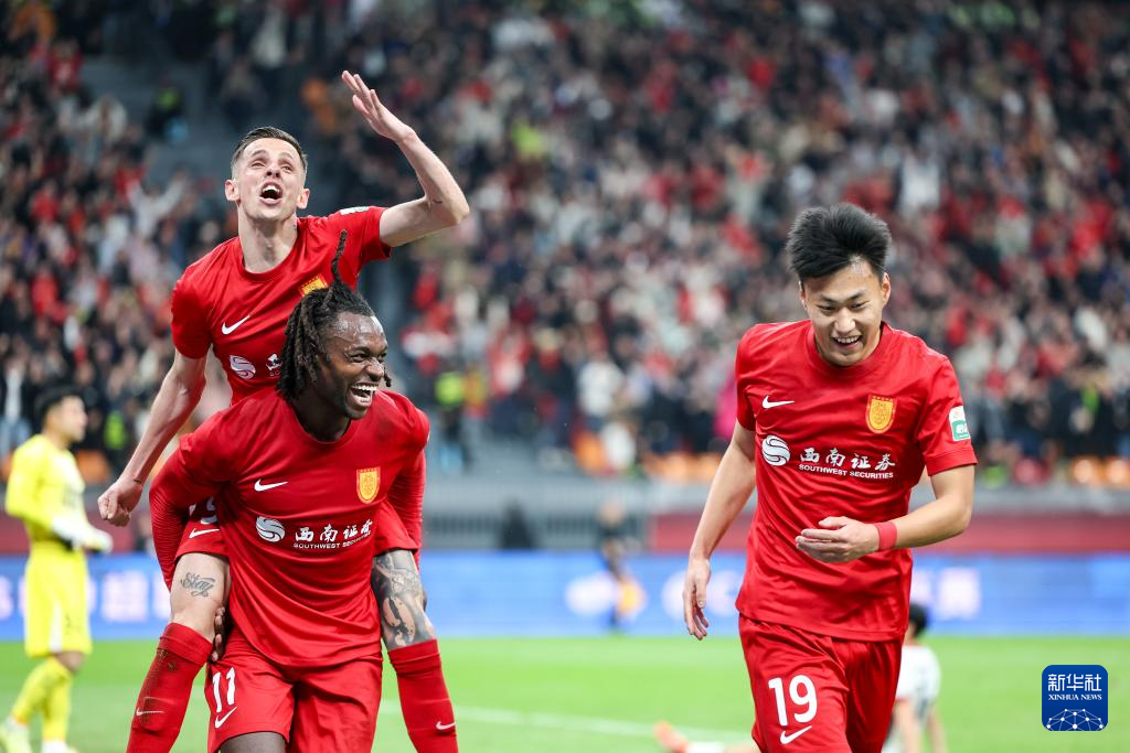 3月21日,重庆铜梁龙队球员在比赛中庆祝进球。