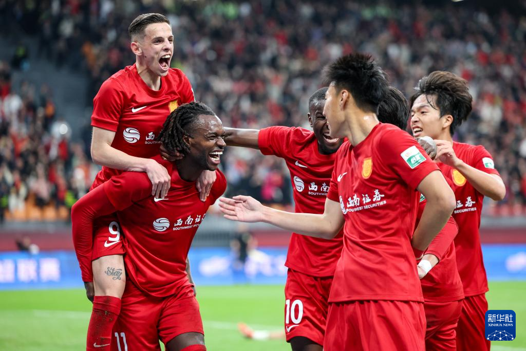 3月21日,重庆铜梁龙队球员迪马塔(前)和队友在比赛中庆祝进球。