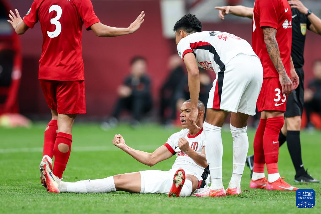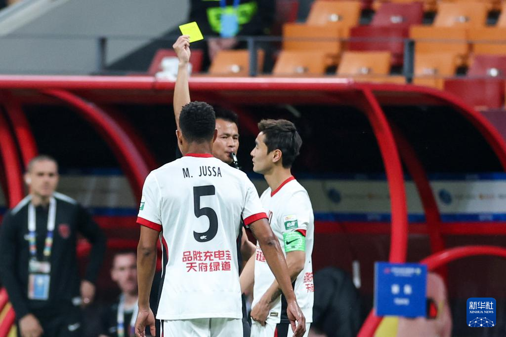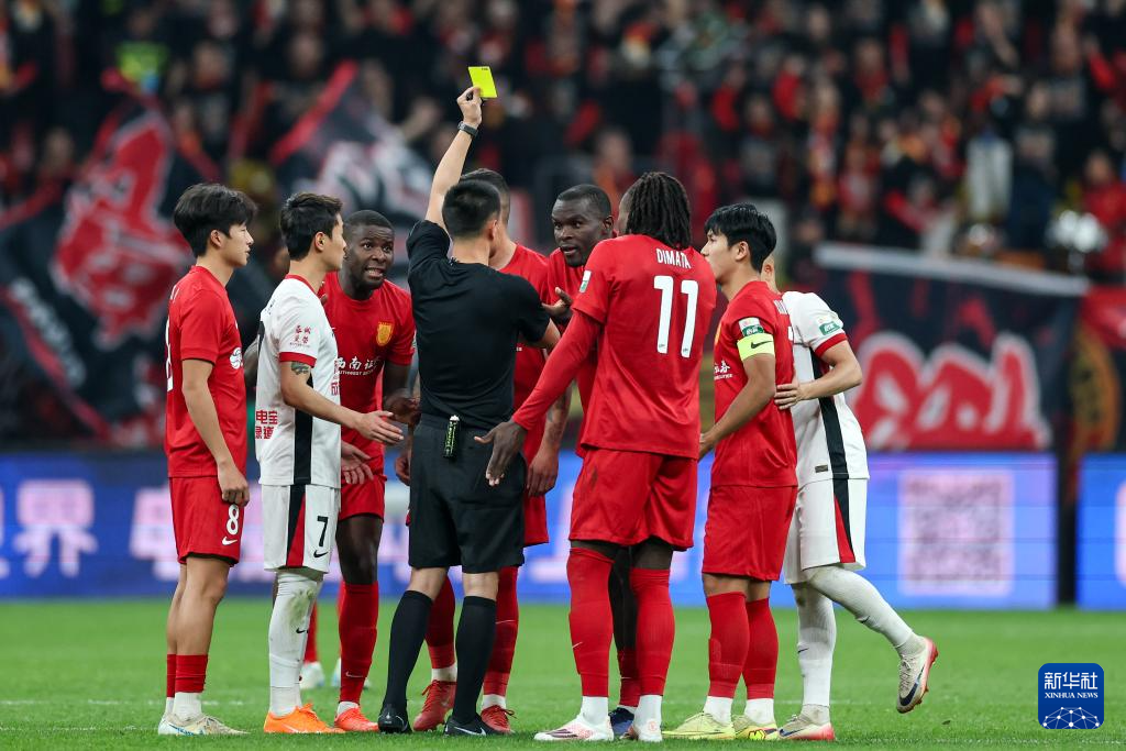 3月21日,主裁判李海新(中)在比赛中向成都蓉城队球员韦世豪(右一)出示黄牌。