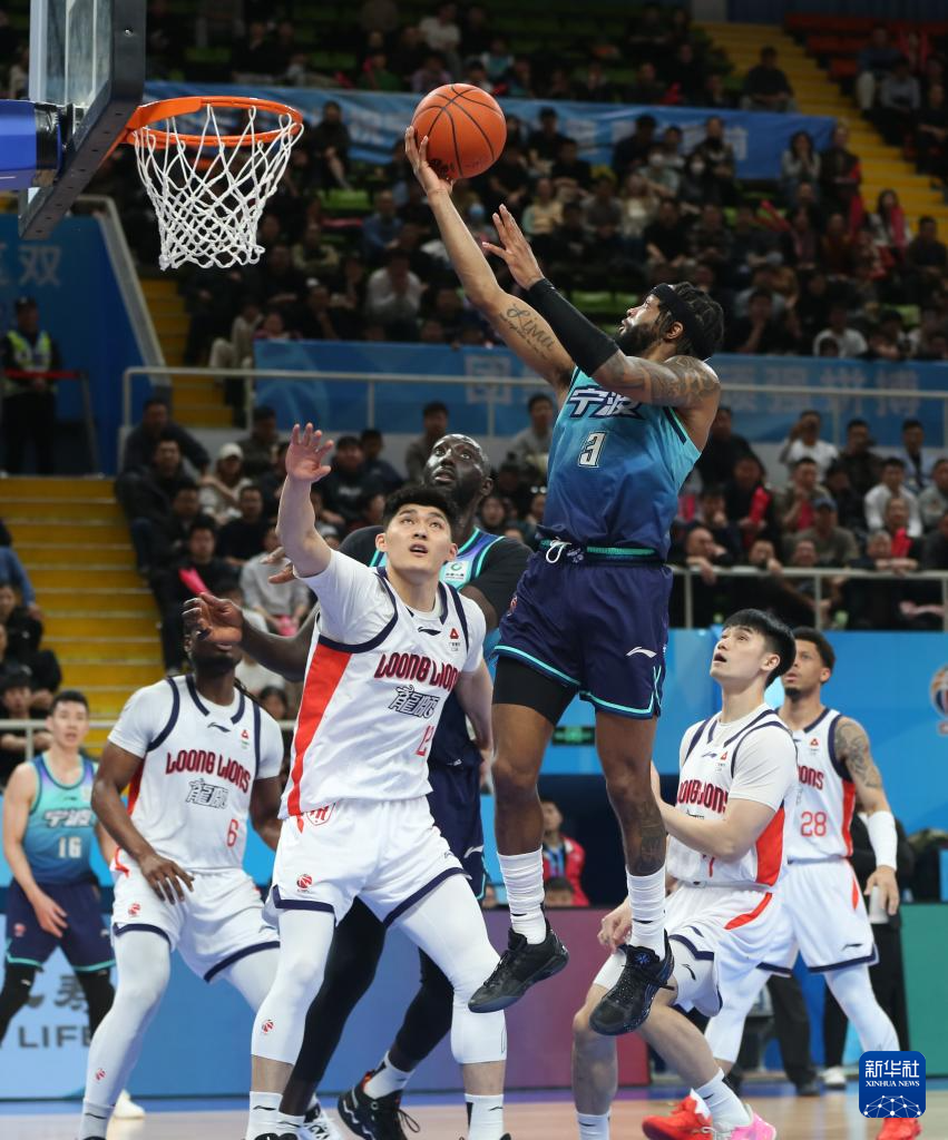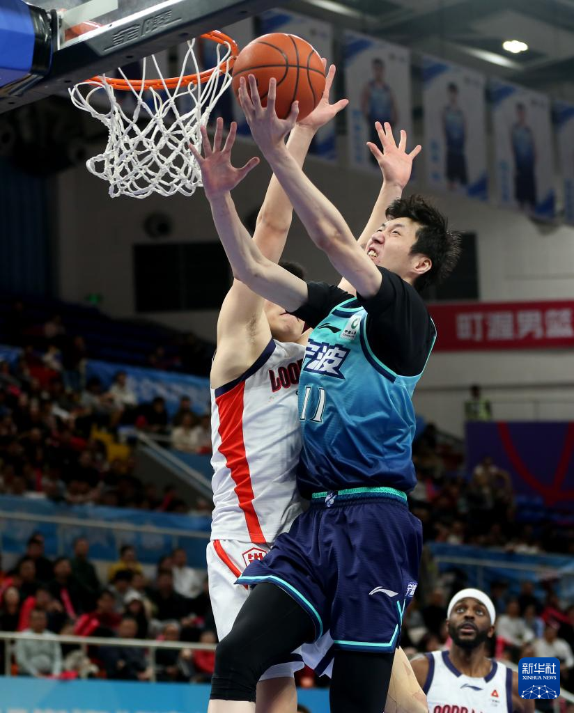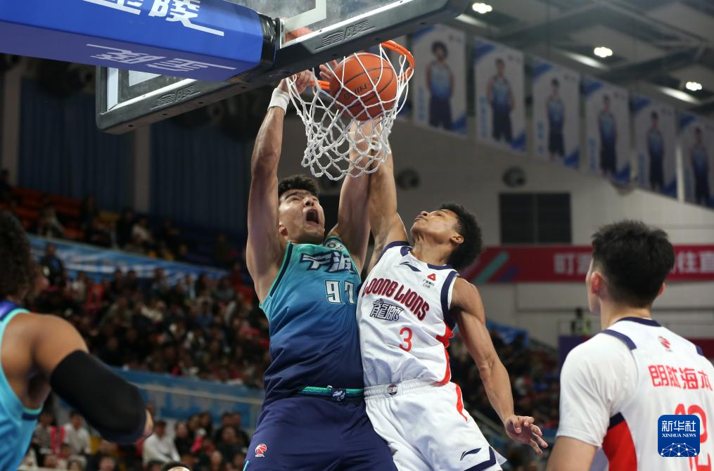 3月21日,宁波町渥队球员鲁吐布拉(左上)在比赛中扣篮。