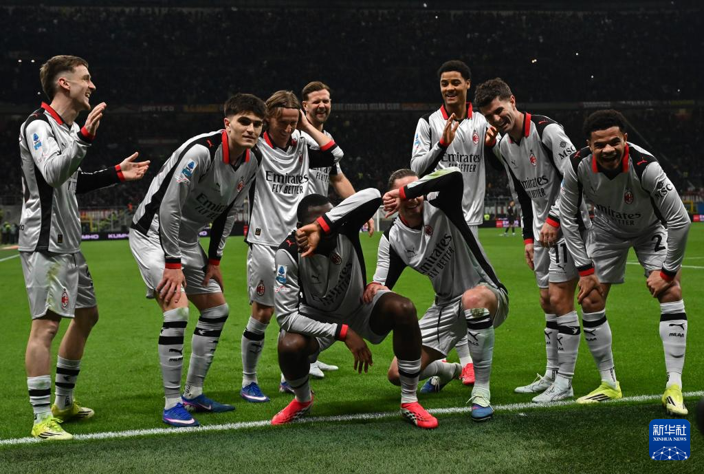 3月21日,AC米兰队球员在比赛中庆祝进球。