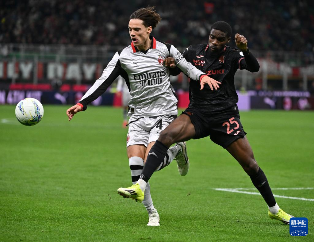 3月21日,AC米兰队球员里奇(左)与都灵队球员恩库恩库在比赛中拼抢。