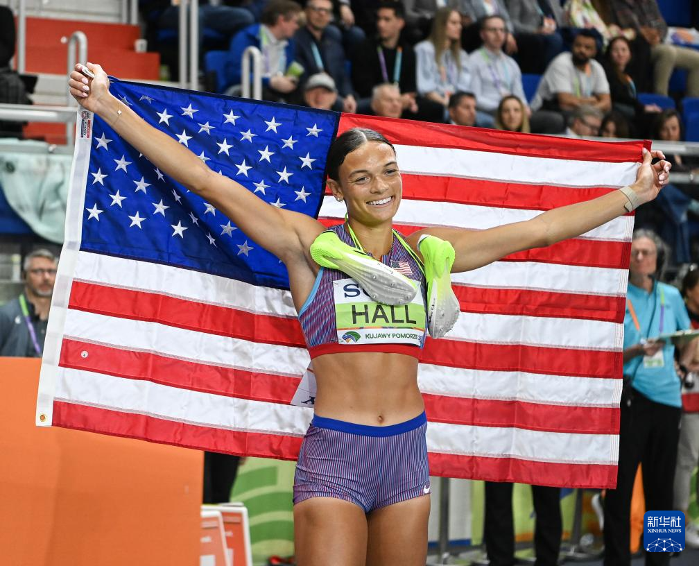 3月22日,美国选手霍尔在赛后庆祝。她以总分第二获得亚军。