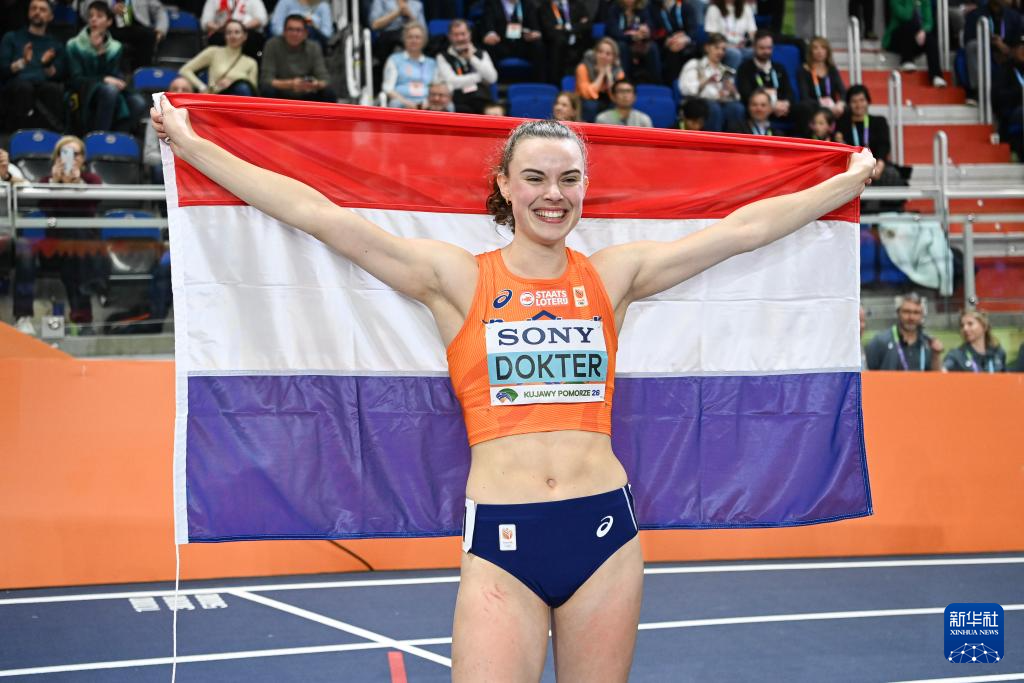 3月22日,荷兰选手多科特在赛后庆祝。她以总分第一获得冠军。