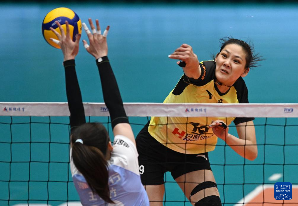 3月25日,山东日照钢铁队球员郭湘玲(右)在比赛中扣球。