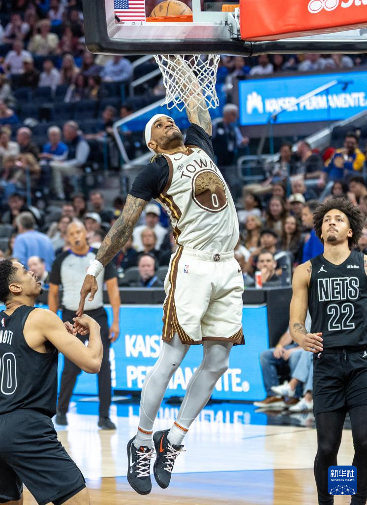 3月25日,勇士队球员佩顿二世(上)在比赛中扣篮。