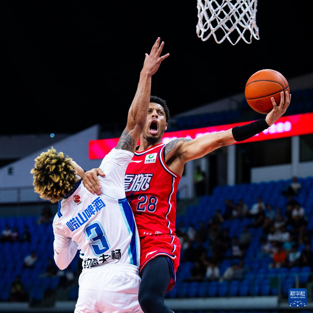 3月26日,广州朗肽海本队球员威金顿(右)在青岛崂山啤酒队球员约瑟夫·杨的防守下上篮。