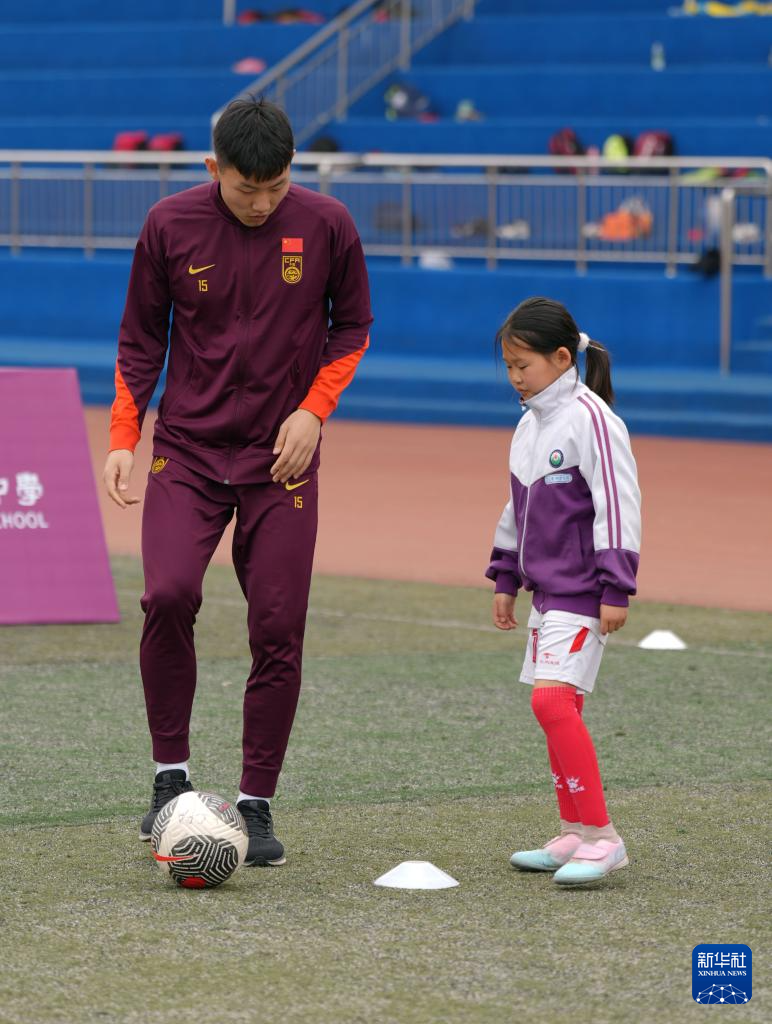 3月26日,中国U23男足助理教练于大宝和球员代表在陕西西咸新区清华附中秦汉学校指导小球员踢足球。