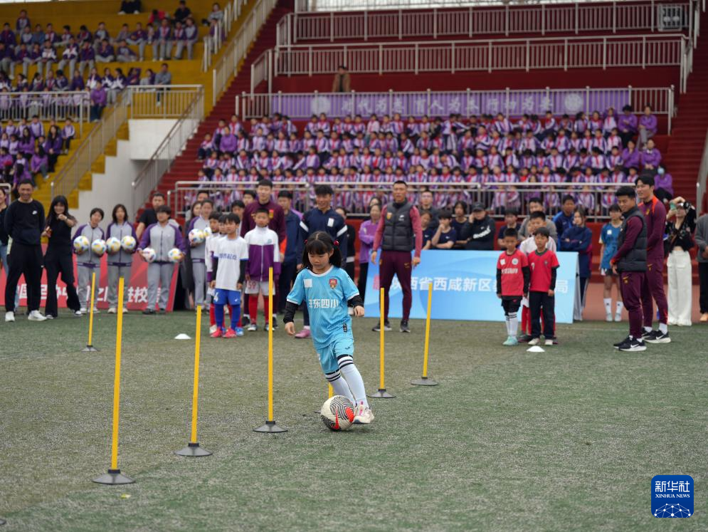 3月26日,球员史松宸(右一)在陕西西咸新区清华附中秦汉学校指导小球员踢足球。