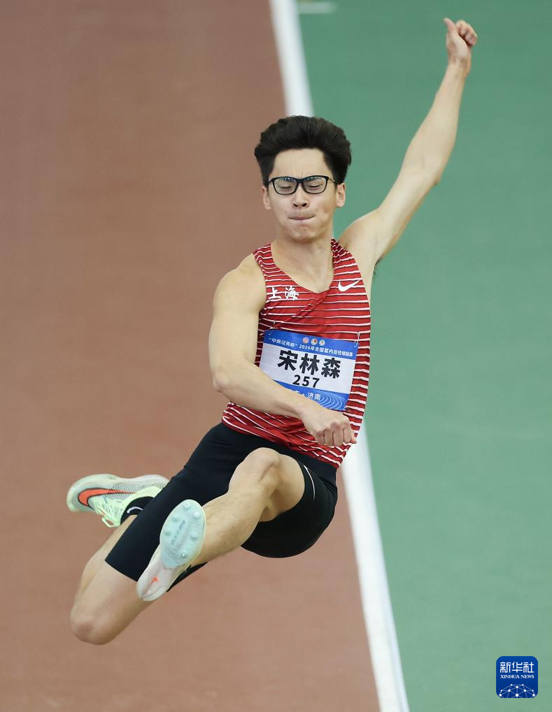 3月27日,上海队选手宋林森在男子七项全能跳远比赛中。