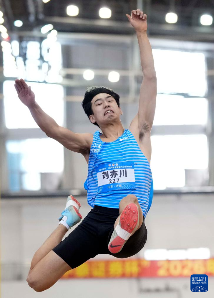 3月27日,山东中泰证券队选手刘亦川在男子七项全能跳远比赛中。