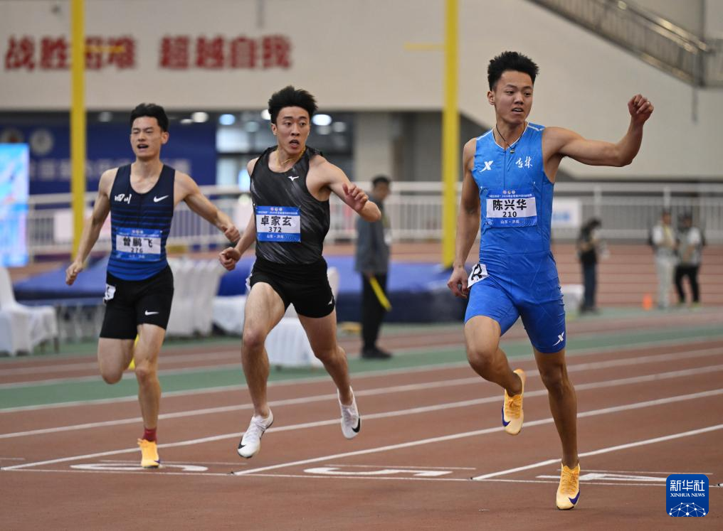 3月27日,山东中泰证券队选手张文熙(中)在男子七项全能60米比赛中。