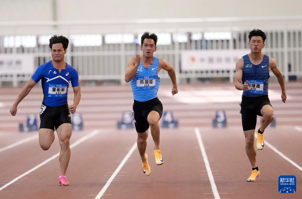 3月27日,广西队选手曾彬彬、山东中泰证券队选手陈国臣和四川队选手刘增晟(从左至右)在男子60米预赛中。他们晋级决赛。