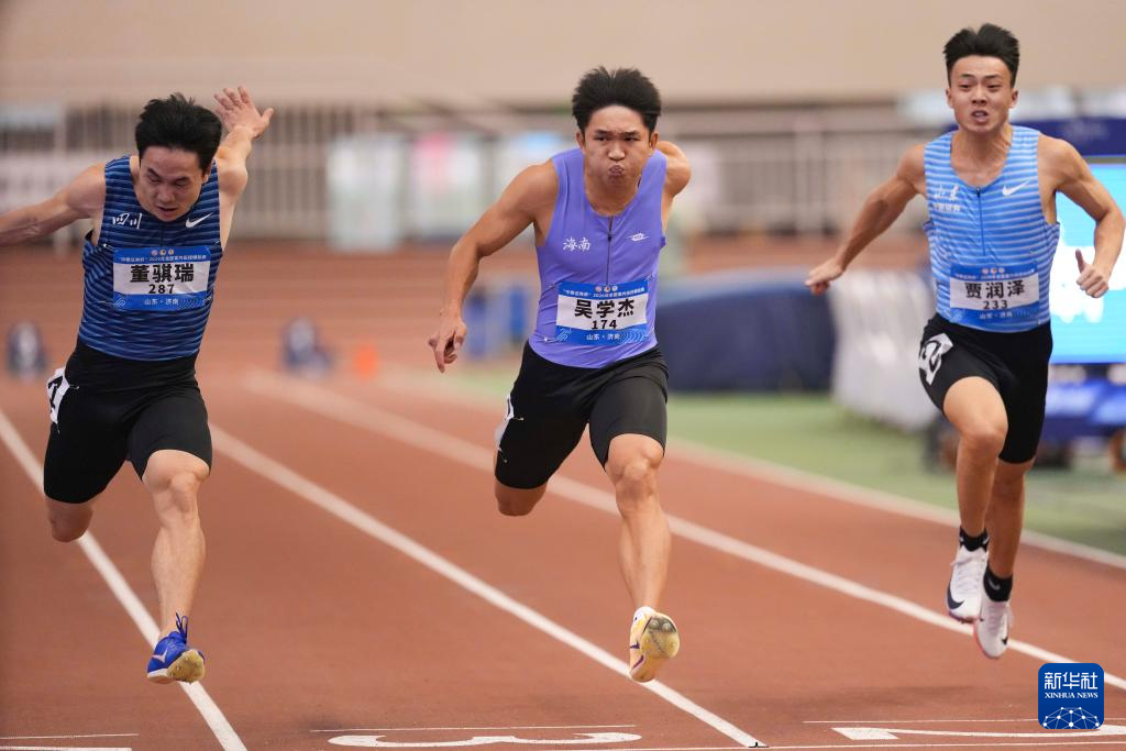 3月27日,海南弹射者队选手吴学杰(右一)在男子60米决赛中,他获得该项目冠军。