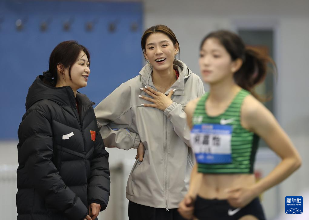 3月28日,上海队选手陆佳雯(中)在女子跳高决赛中与北京队选手金若宣(左)交流。她们分获该项目冠亚军。