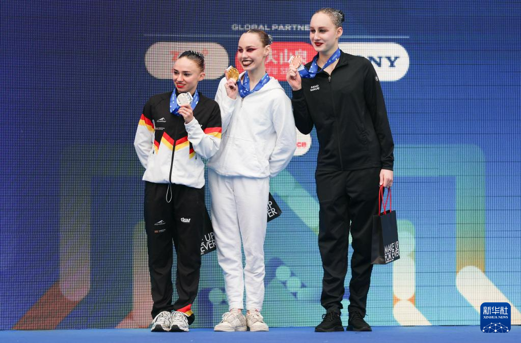 3月27日,中立运动员汉多什卡(中)、亚军德国选手克拉拉·布莱尔(左)和季军中立运动员普列汉诺娃在颁奖仪式上。