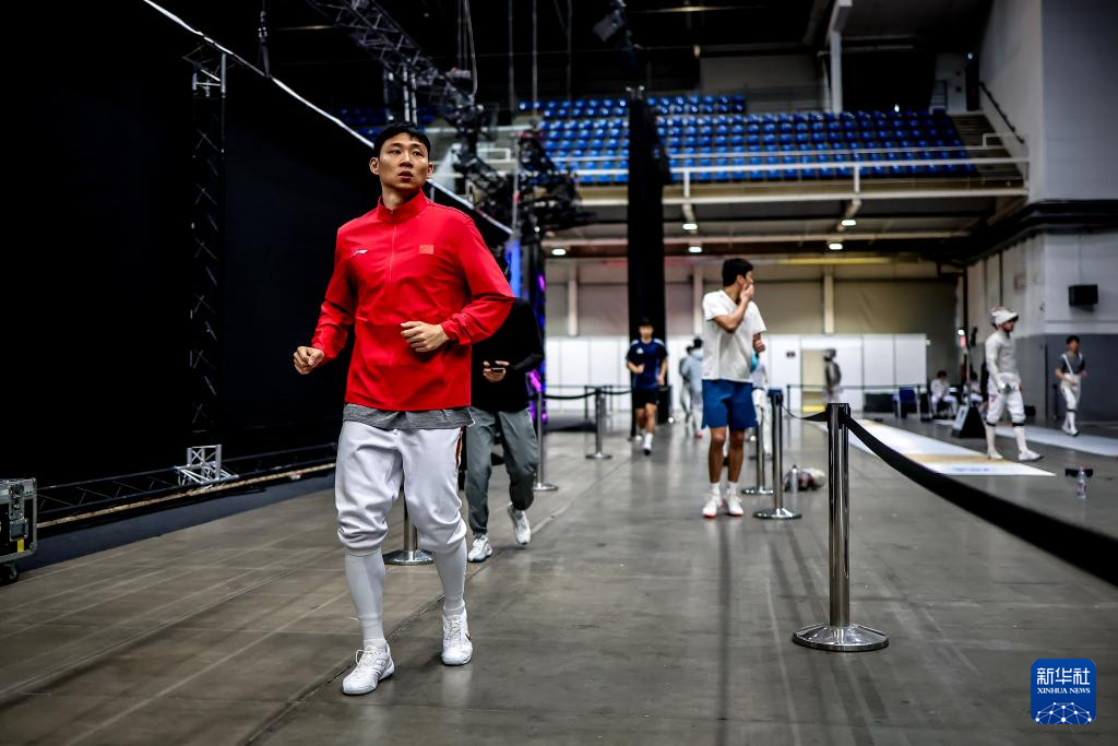 3月27日,中国队选手周俊炜在资格赛前跑步热身。