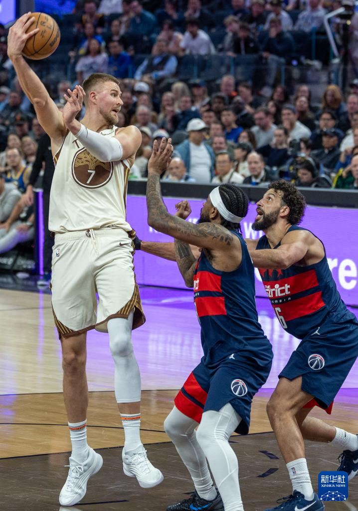 3月27日,勇士队球员克里斯塔普斯·波尔津吉斯(左)在比赛中进攻。